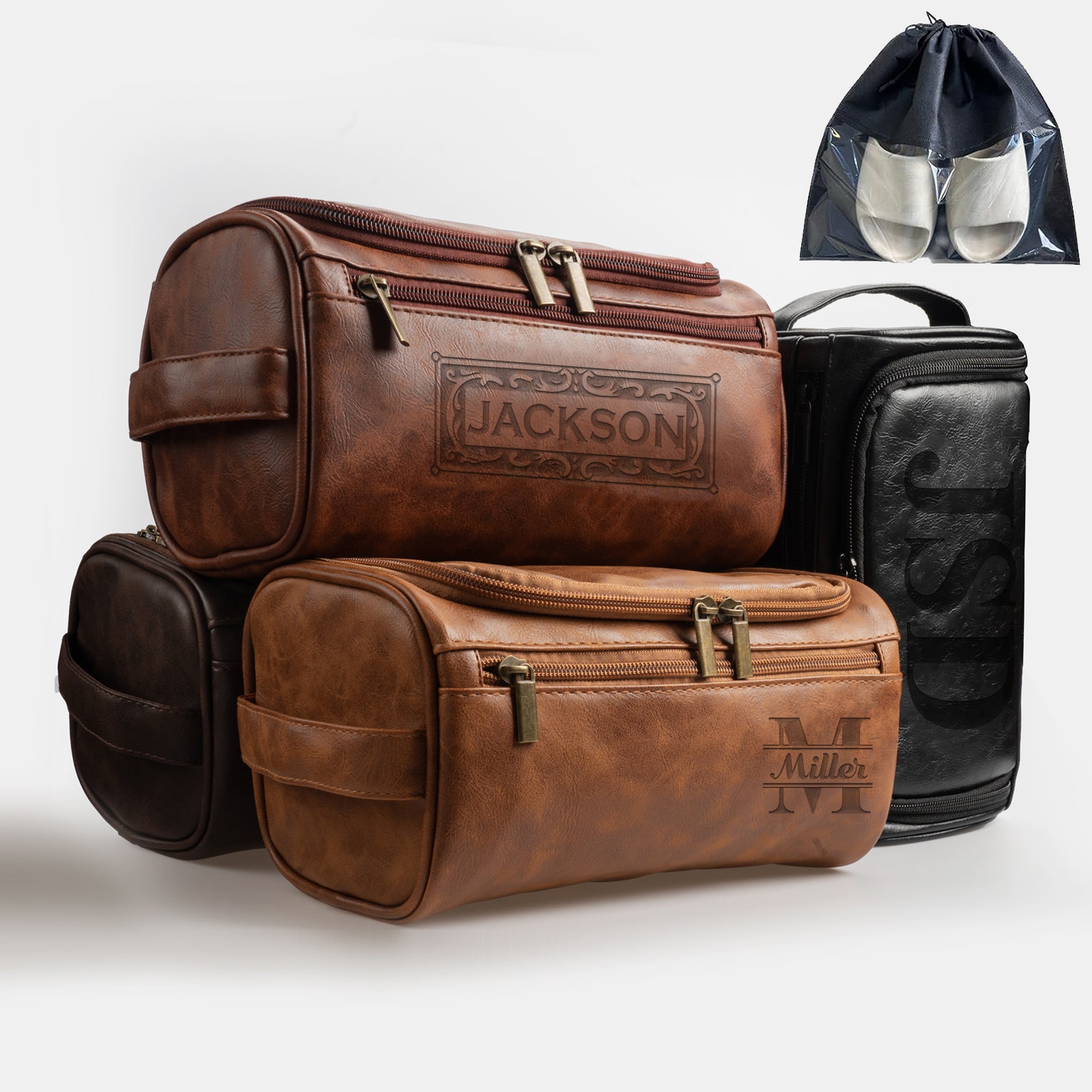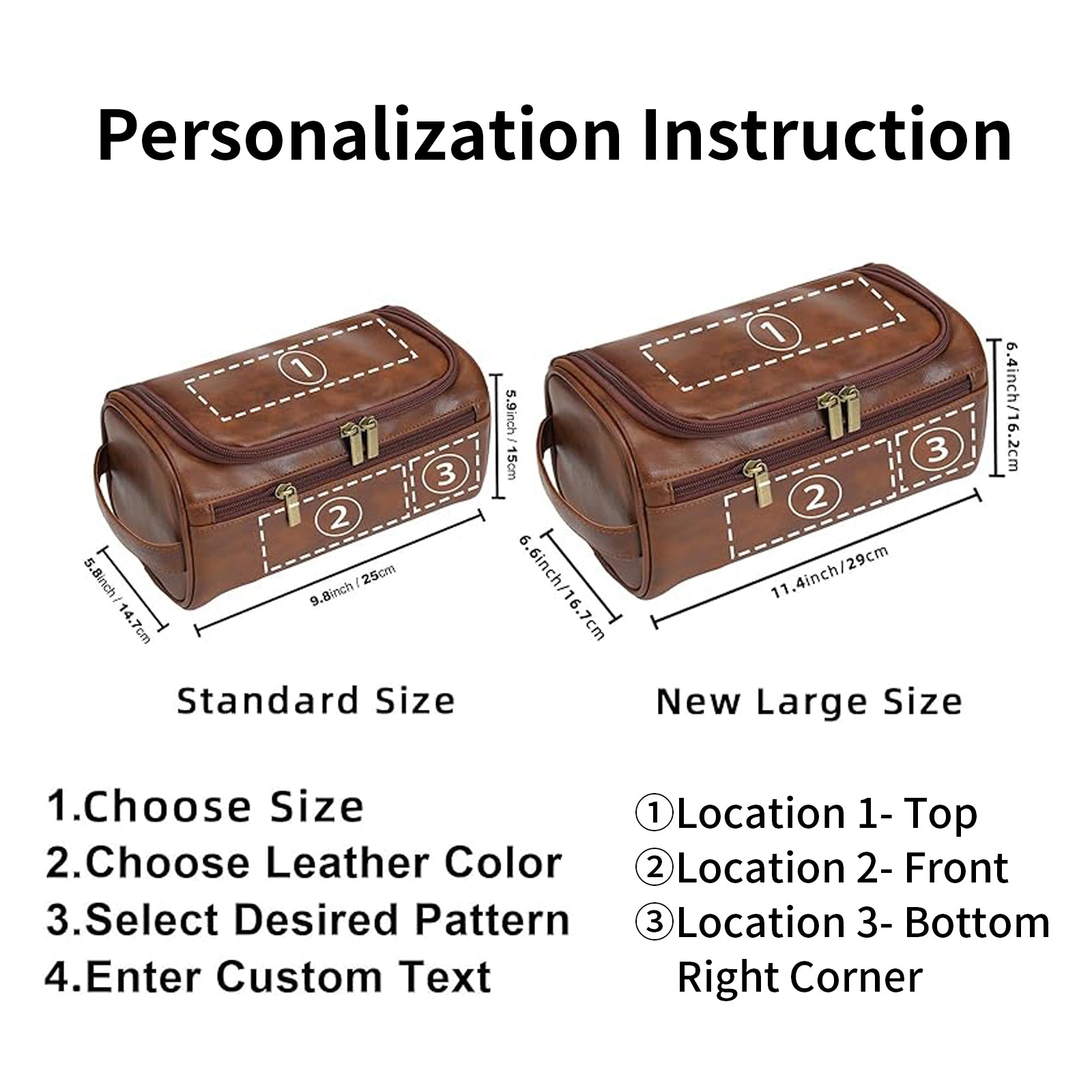 【Personalized Leather Toiletry Bag】Our leather toiletry bag comes in 4 colors, 2 sizes, and 12 customizable styles to choose from. You can select your preference and input custom text, and we will engrave your chosen style and name. It will become your unique personalized toiletry bag.