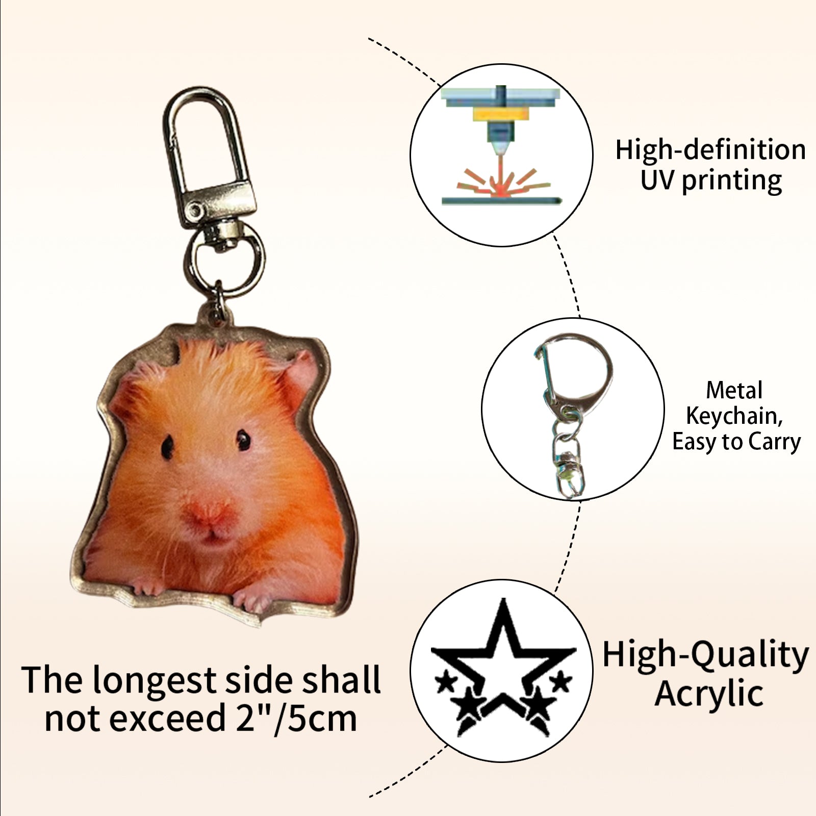 This pet keychain seamlessly combines fashion, personalization, and durability, making it an ideal choice for pet owners and gift-givers alike. Each keychain is meticulously crafted from premium acrylic material and undergoes advanced UV printing technology to ensure vibrant, high-definition images that capture attention. Its dual-sided printing feature allows customers to showcase their pets in various poses—from adorable close-ups to playful full-body shots, and even scenic backgrounds. What sets this keychain apart is its versatility to accommodate custom images of infants or adults, serving as a cherished family keepsake.