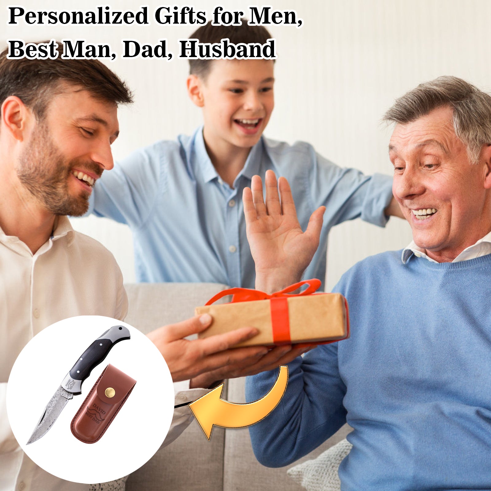 Personalized Damascus steel folding knives make the perfect gift for men, ideal as cool additions to your hunting and camping gear. Whether for groomsmen, fathers, or husbands, these knives are excellent accessories for birthdays, wedding, anniversaries, and other special occasions. Featuring a sharp blade, PU leather sheath, and presented in a black gift box, they can be engraved with personalized details on both the handle and sheath, complementing your outdoor gear perfectly.