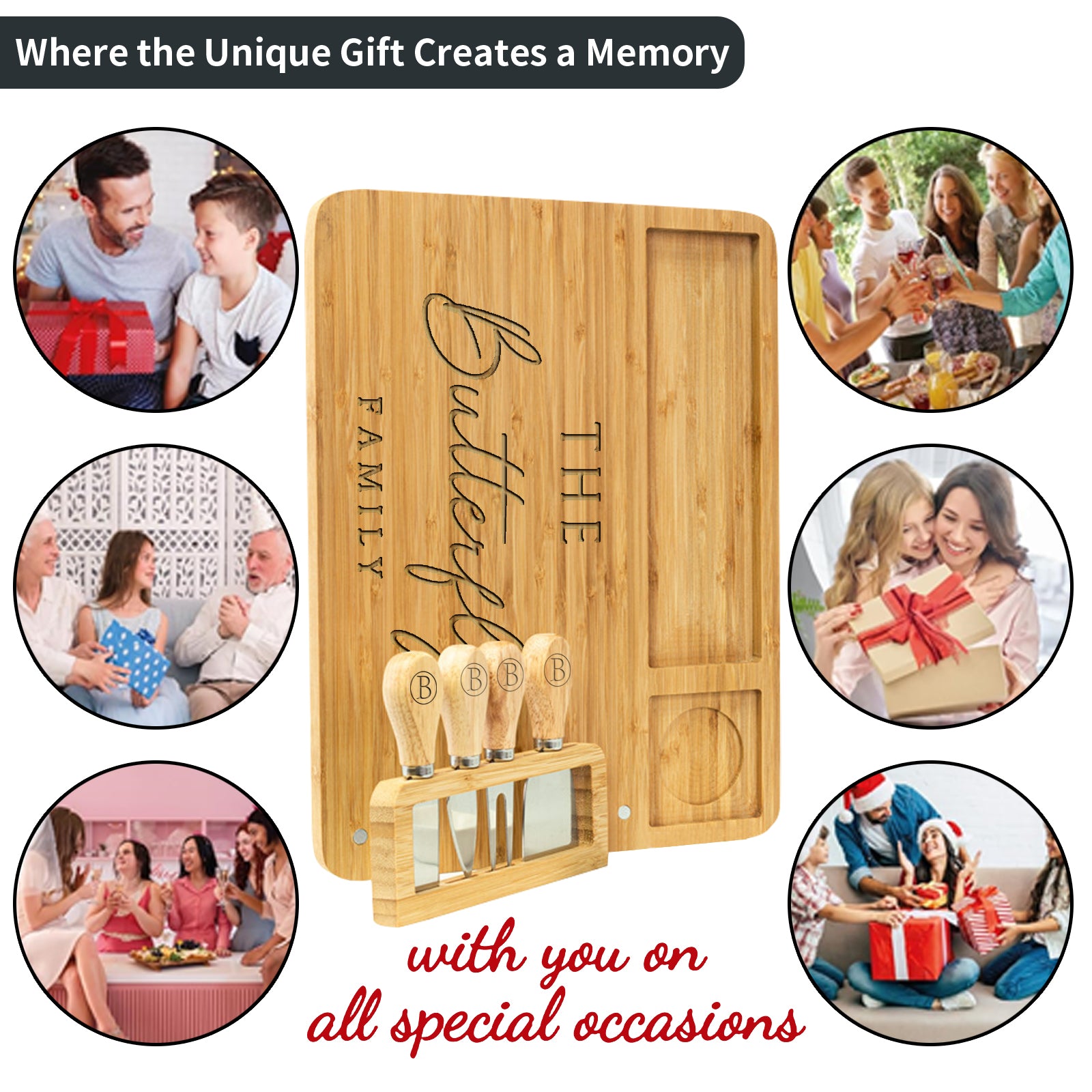 Personalized Cheese Board Set: This versatile set includes a bamboo cheese board and 4 stainless steel utensils, making it perfect for wedding gifts, birthday presents, anniversary celebrations, bridal showers, gifts for him or her, and as a delightful addition to any happy couple's home.