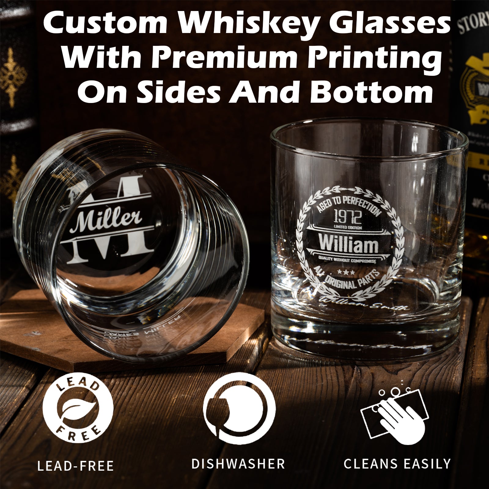 Customized whiskey glasses make the perfect gift for men! Let them indulge in their favorite bourbon or Scotch whiskey. Each glass stands 3 inches tall with a capacity of up to 11 ounces. We use advanced UV printing technology for clear and smooth personalization that is dishwasher-safe.